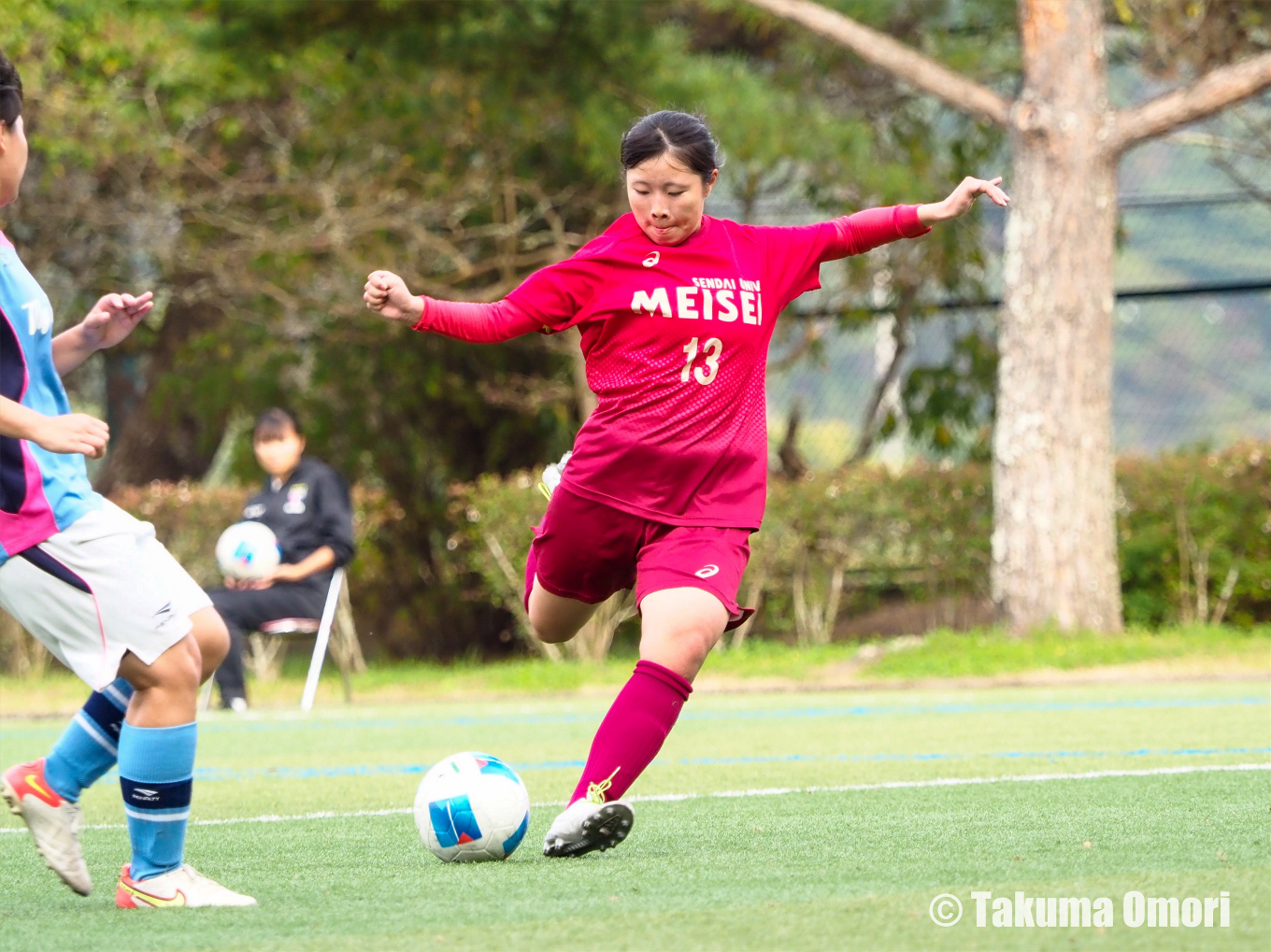 試合が動いたのは前半7分。中央やや左でボールを持ったMF白取奏愛(3年)がカットインから鮮やかなミドルシュートを沈める。早々にリードした仙台大明成は白取が長短のパスを織り交ぜながら攻撃を組み立て、積極的にシュートを狙っていく。