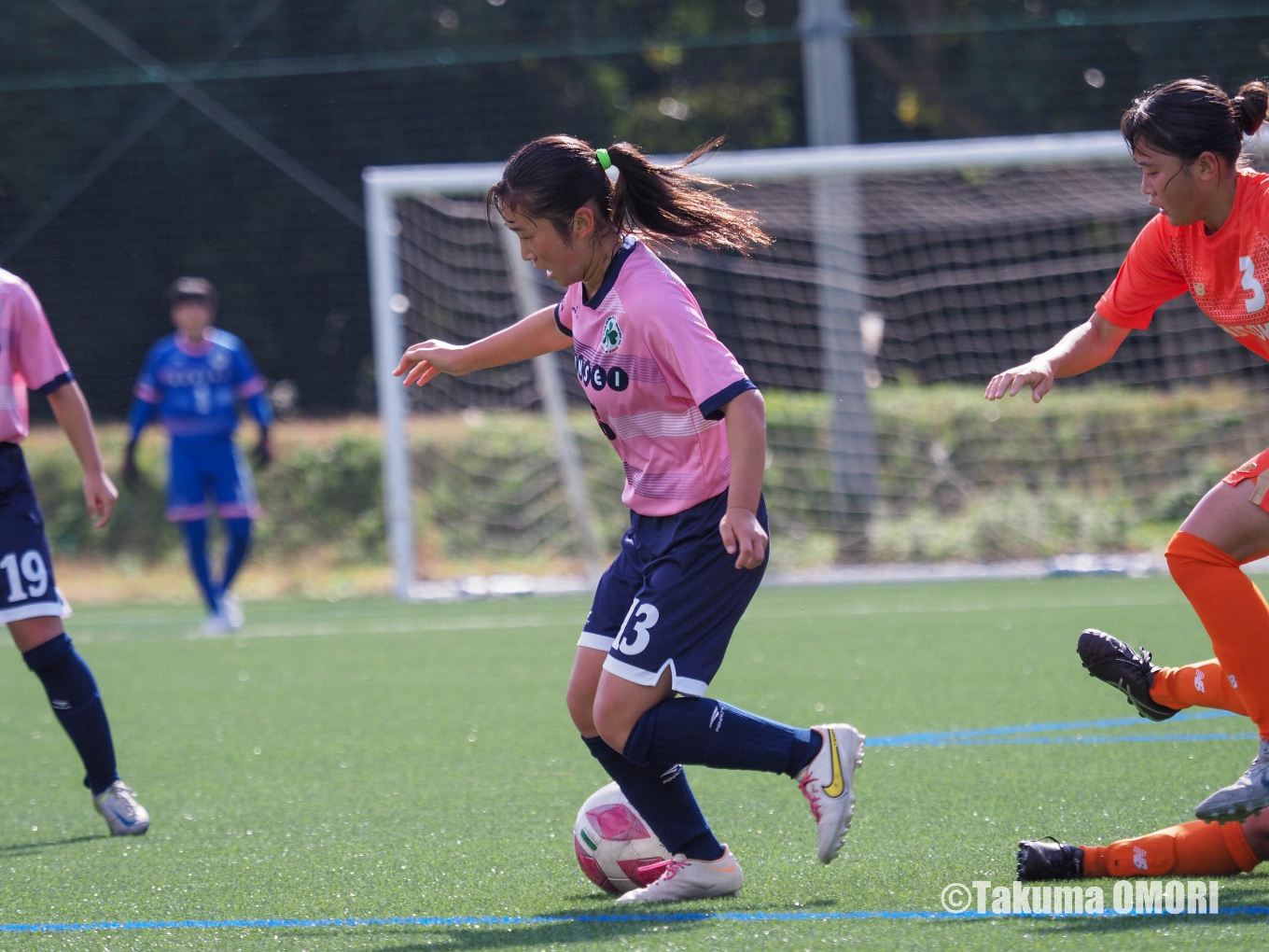 前半35分にはカウンターから3点目を奪う。自陣で相手ボールホルダーに厳しくプレスをかけると、横パスを右SB井上あや(3年)がインターセプト。小川結羽(2年)の落としを荻島美空(1年)がDFラインの裏へフィードする。GKも飛び出すが、その一歩手前で触った那須野がゴールに流し込む。那須野はハーフタイムを待たずにハットトリックを達成。3−0として前半を折り返した。
